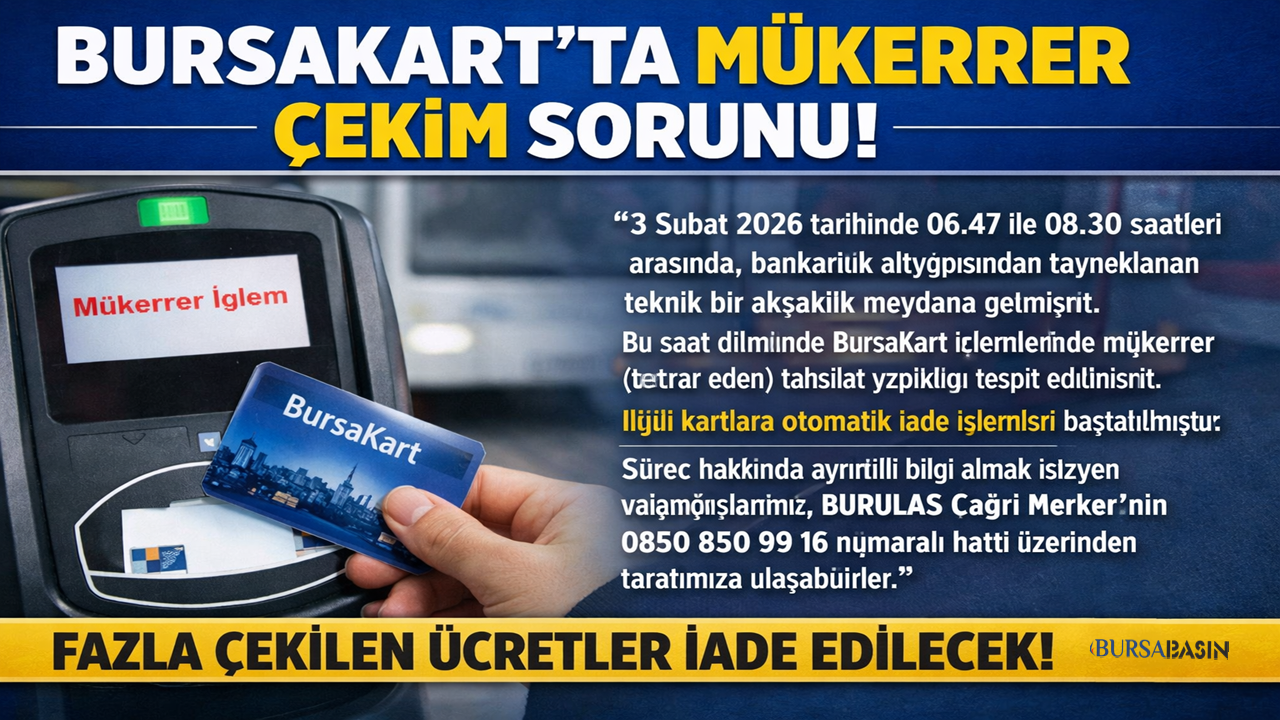 BURULAŞ tarafından paylaşılan bilgilere göre, 06.47 ile 08.30 saatleri arasında gerçekleştirilen BursaKart işlemlerinde tekrar eden tahsilatlar yapıldı. Sorunun fark edilmesinin ardından gerekli inceleme ve kontrol süreçleri devreye alındı.